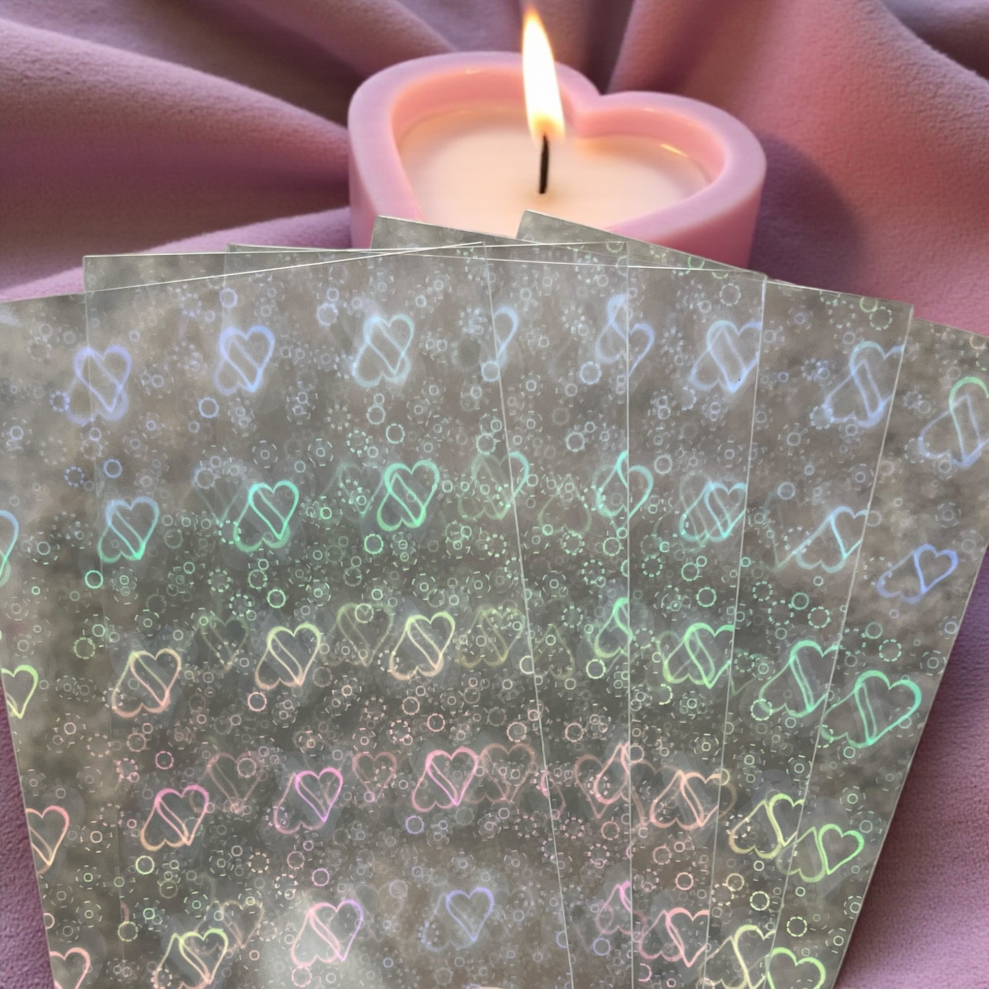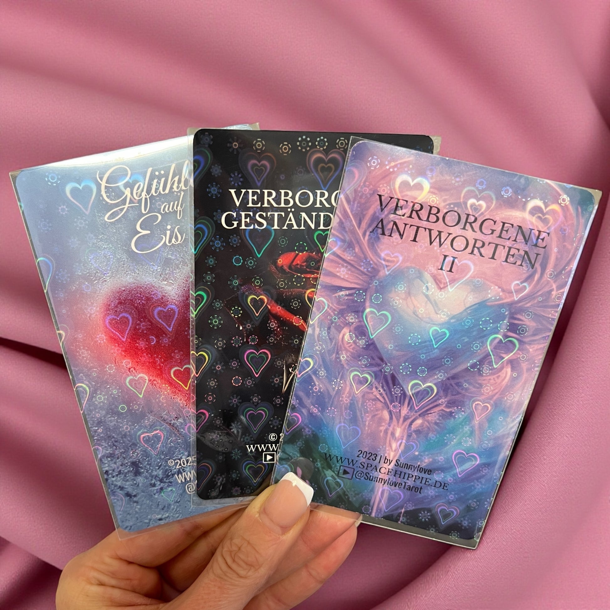 Die transparenten Sleeves mit schillernden, holografischen Herzen reflektieren das Licht je nach Blickwinkel in sanften Regenbogenfarben und verleihen deinen Karten eine magische, fast kosmische Aura. Diese Herzchen sind nur auf einer Seite, die andere ist transparent, sodass die Botschaften der Karten gut lesbar bleiben.